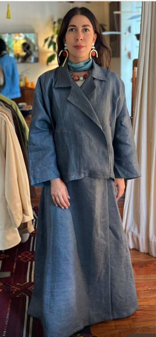 Falda larga envolvente con tiras gruesas para amarre al costado o atras. Corte en A