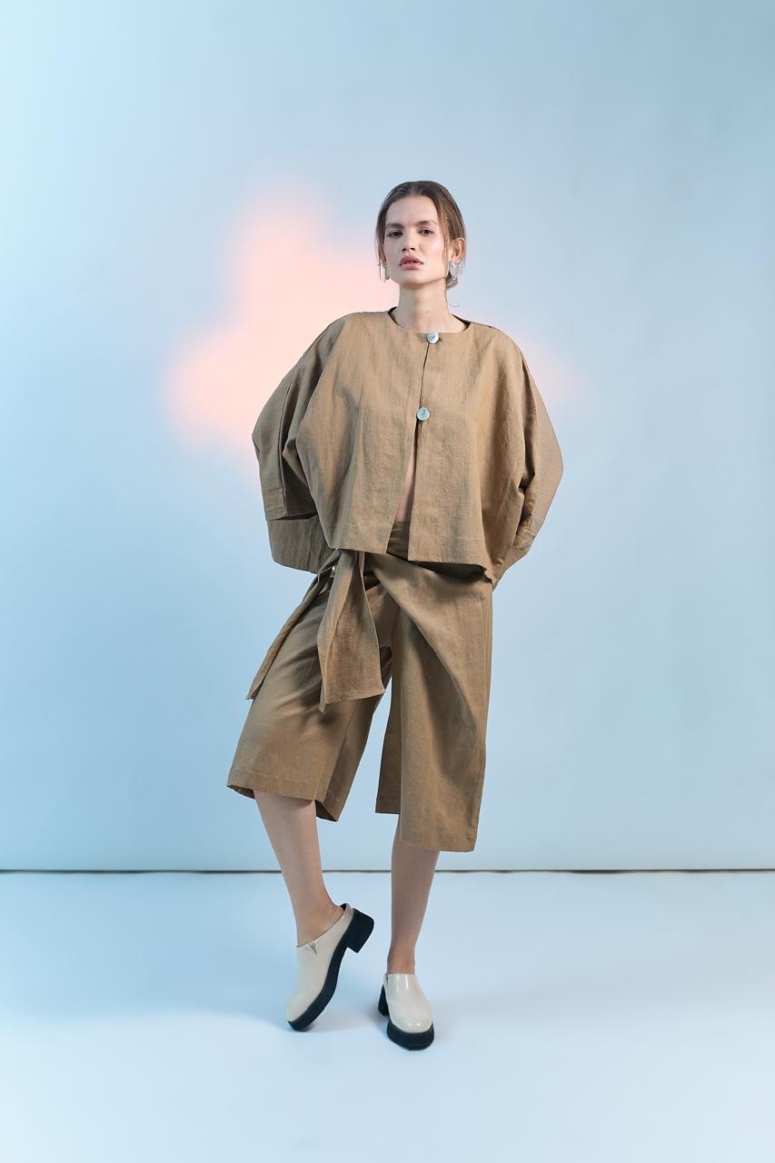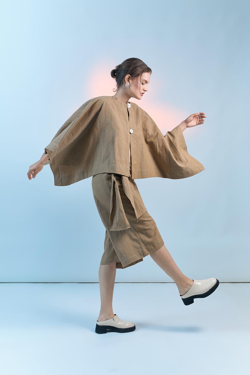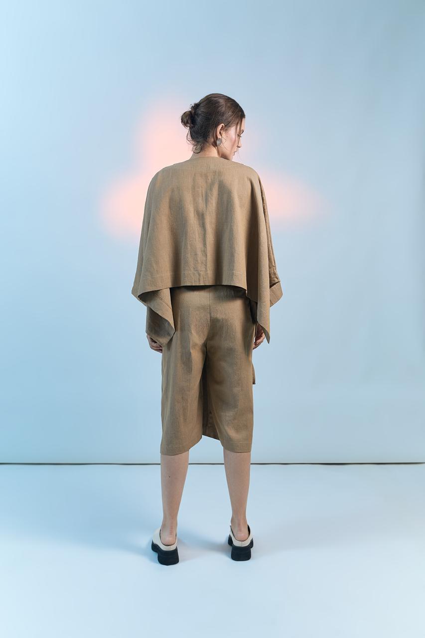 Bermuda en lino cafe jaspe con amarre tipo falda.