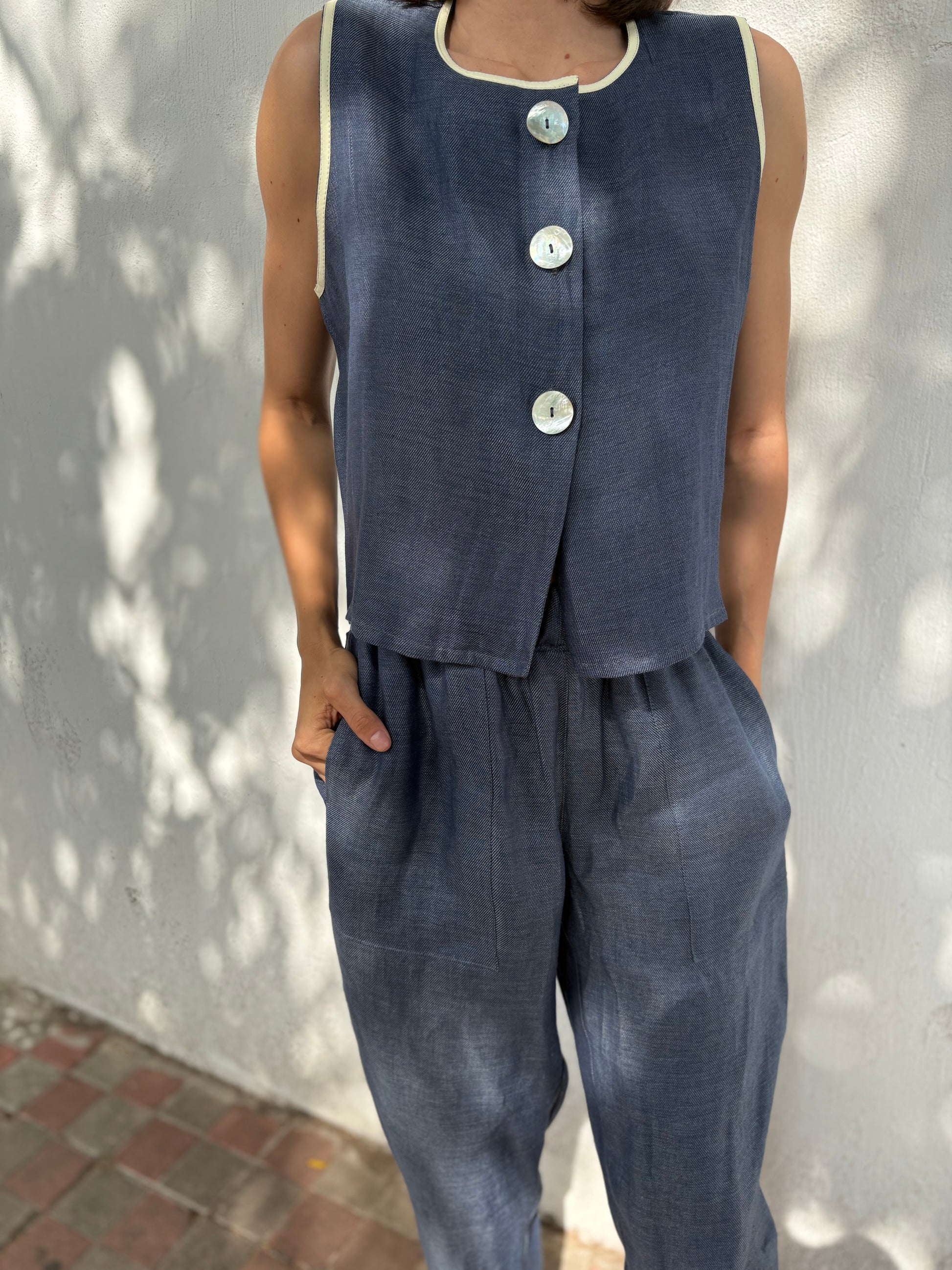 Blusa en lino con 3 botones en el centro para cierre opcion de blusa o chaleco, detalle de color beige en cuello y sisas.