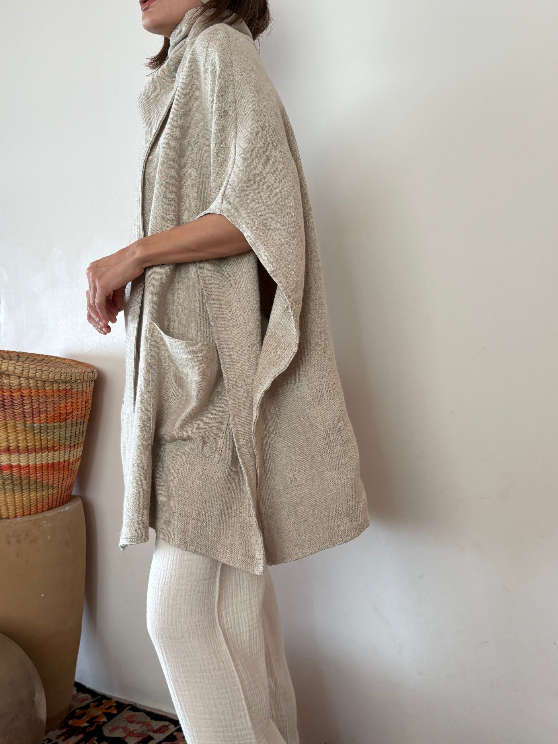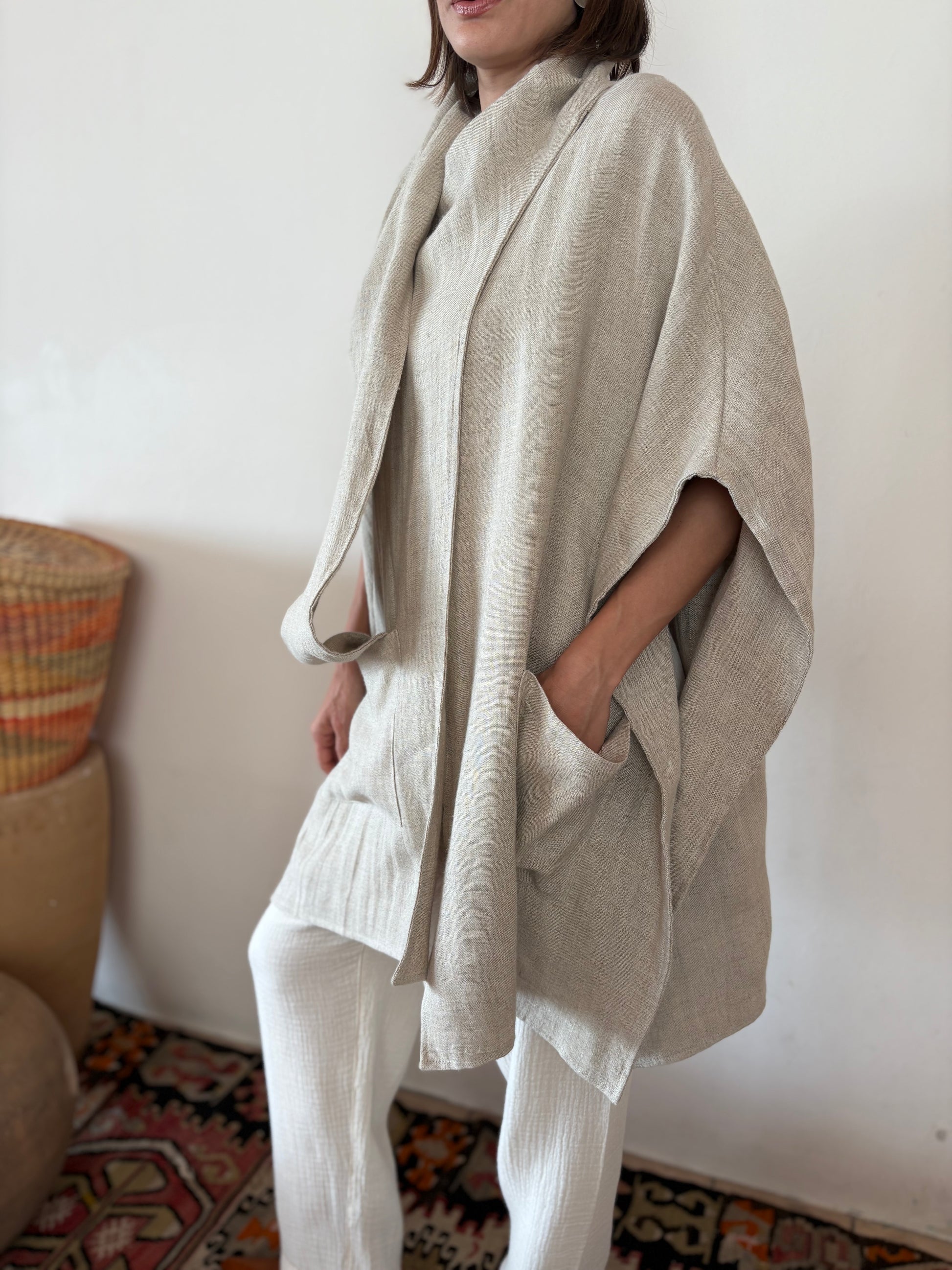 Capa con bolsillos al frente. tira en un costado para enrollar en cuello o poner solo hacia atras. pespuntes en costados para. que cierre la capa.