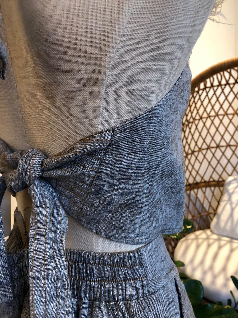 Top Halter Ava con tiras de amarre largas y pespuntes en contraste en parte de atras dond ese amarra