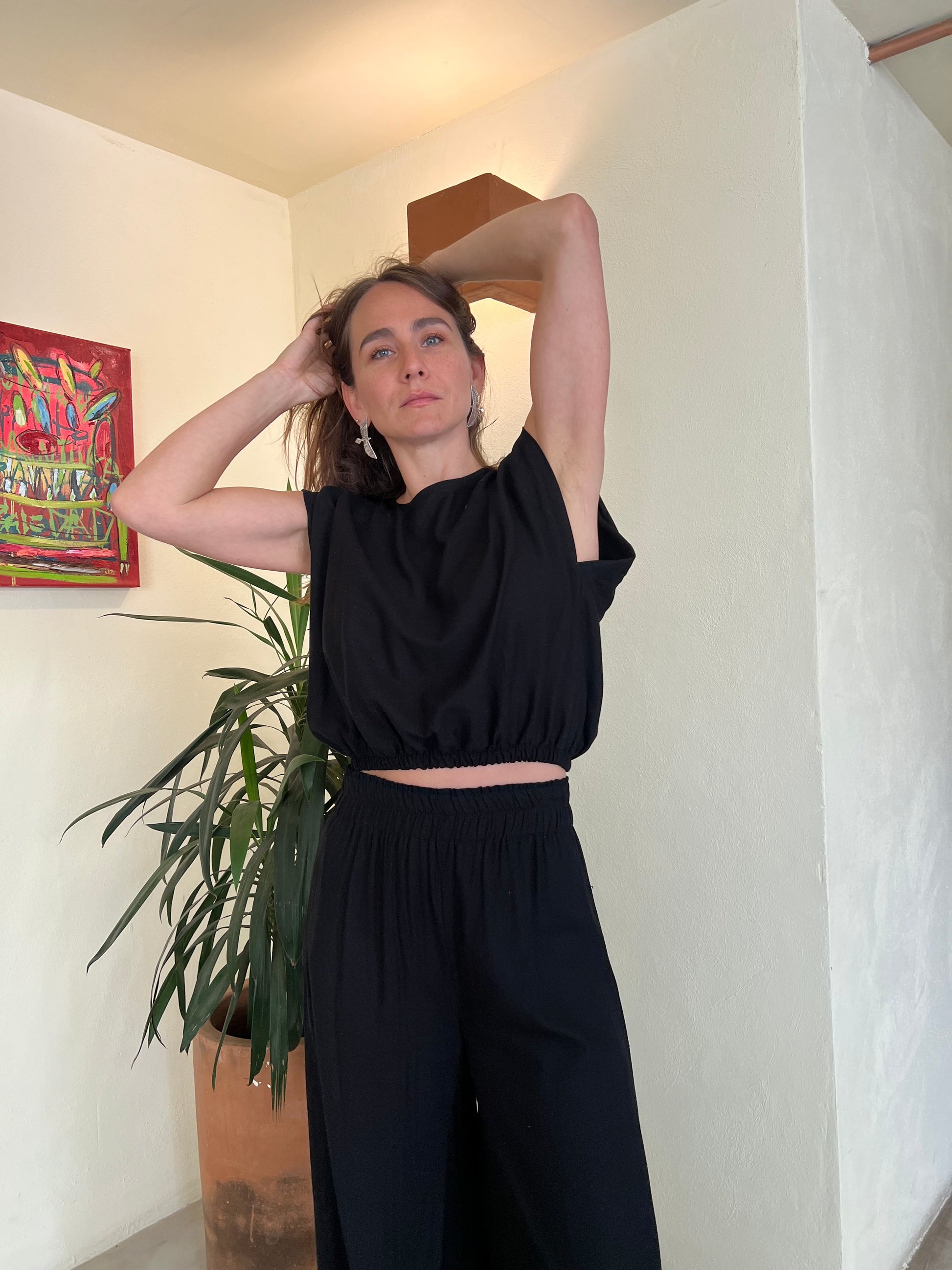 Top corto de lino con elástico en cintura y boton en cenrto espalda.